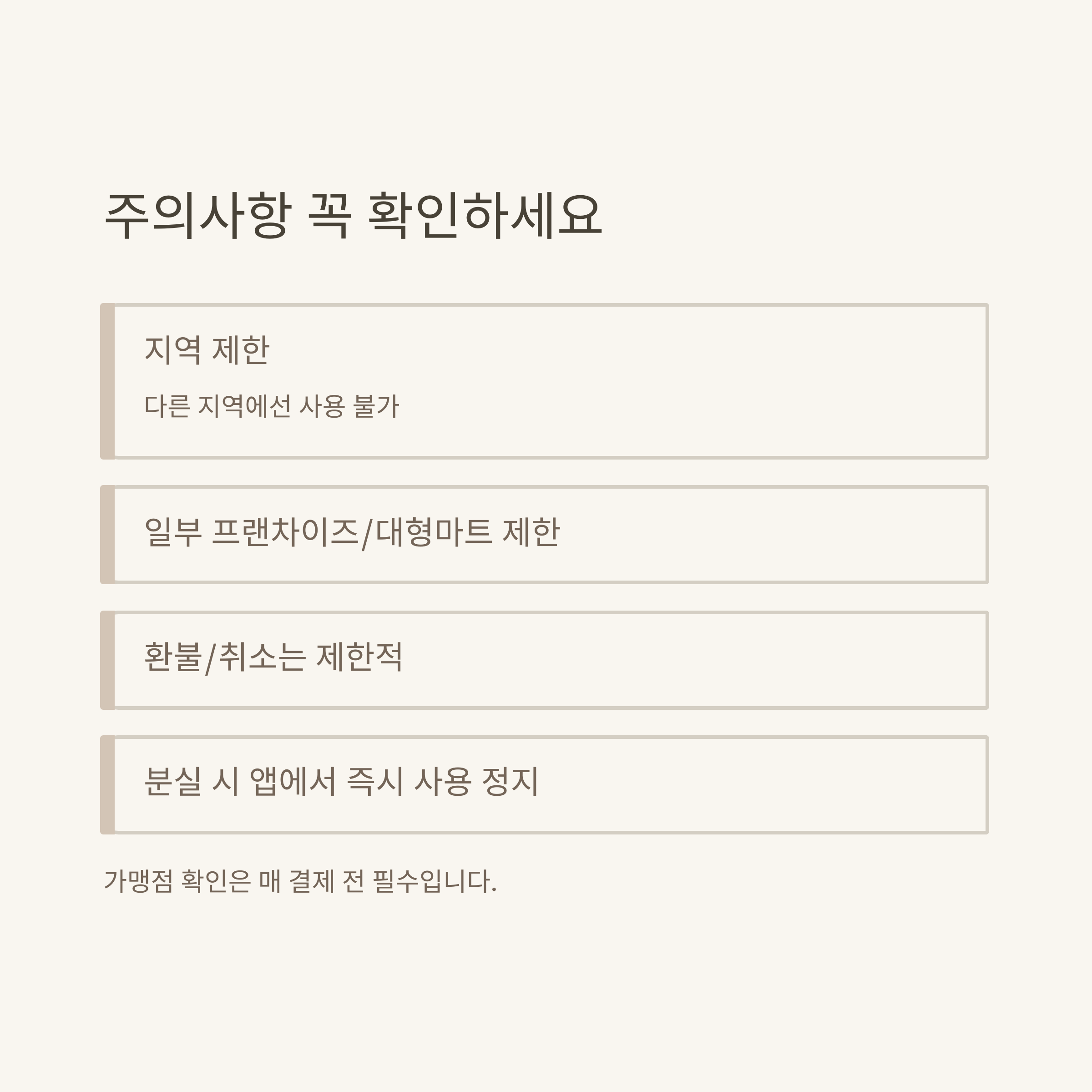 - 가맹점마다 결제 가능 여부 반드시 사전 확인