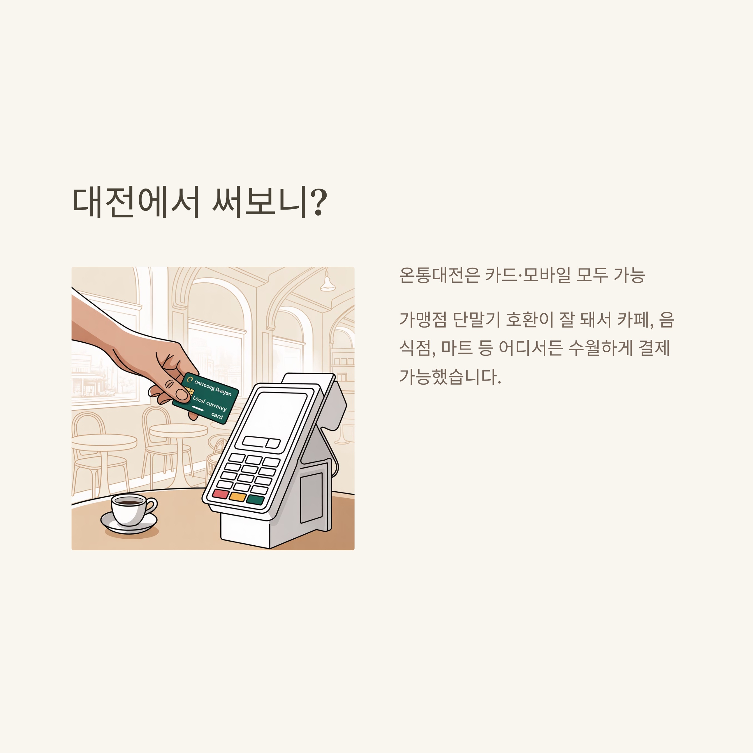 | 대전 | 온통대전 카드·앱 결제 모두 편리 | QR/카드 단말기 넓은 지원 |