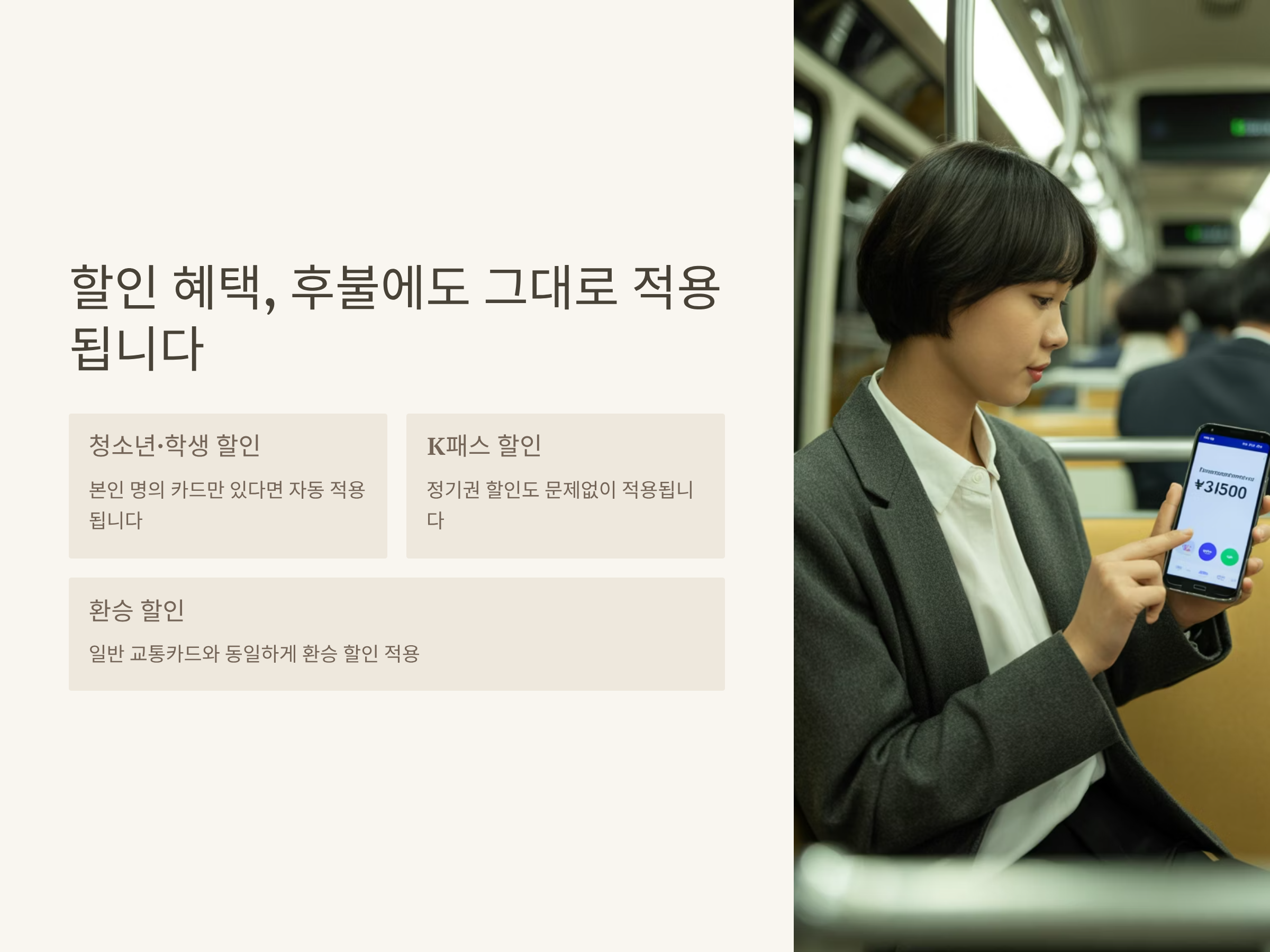 - 할인, 청소년/학생 적용, 내역 앱 실시간 확인