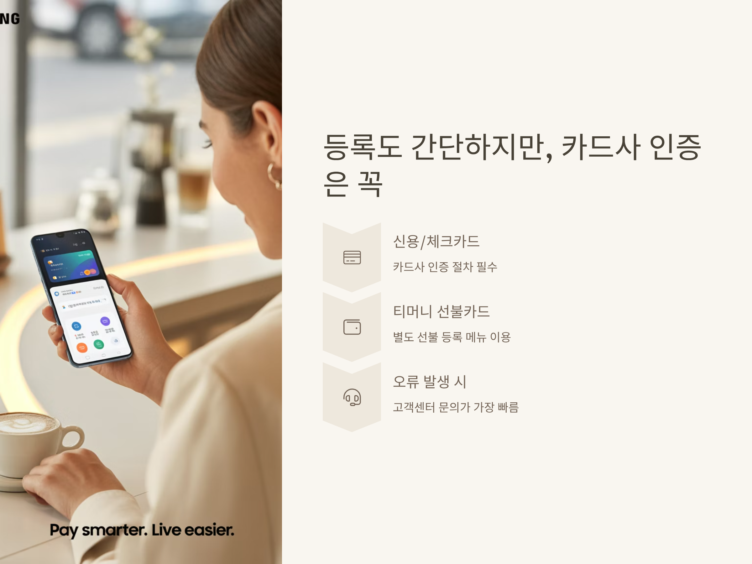 - 삼성페이 앱 실행 → 신용/체크/티머니카드 등록