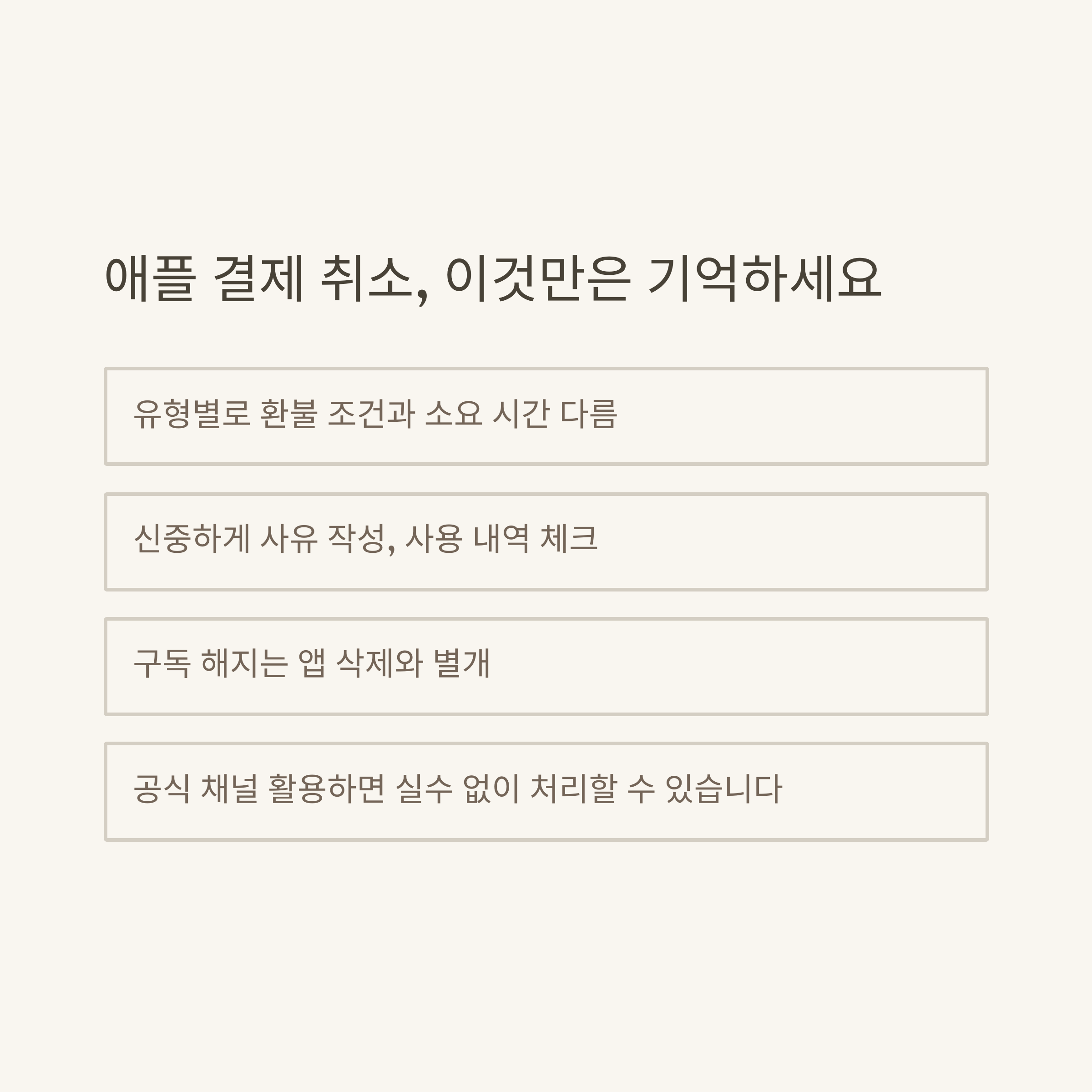 정확한 환불 기준과 절차는 애플 결제 환불 정책에서 공식적으로 안내하고 있습니다. 환불이 지연되면 결제 수단별 고객센터에 꼭 문의해보세요.